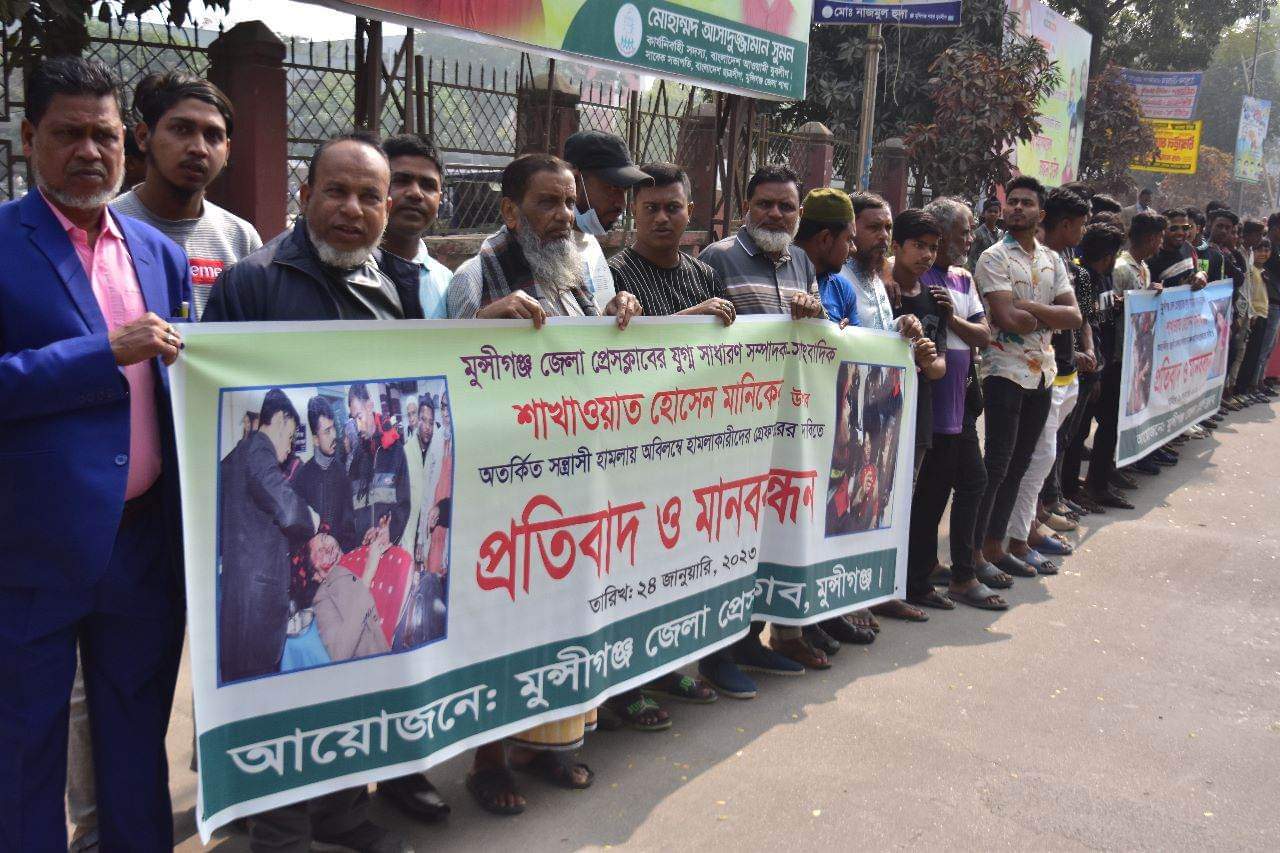 মুন্সীগঞ্জ জেলা  প্রেসক্লা‌বের যুগ্ম-সাধারণ সম্পাদক  সাখাওয়াত হো‌সেন মা‌নিকের ওপর হামলার প্রতিবাদে মানববন্ধন হয়েছে ।  মঙ্গলবার বেলা  ১১ টার সময়   মুন্সীগঞ্জ
