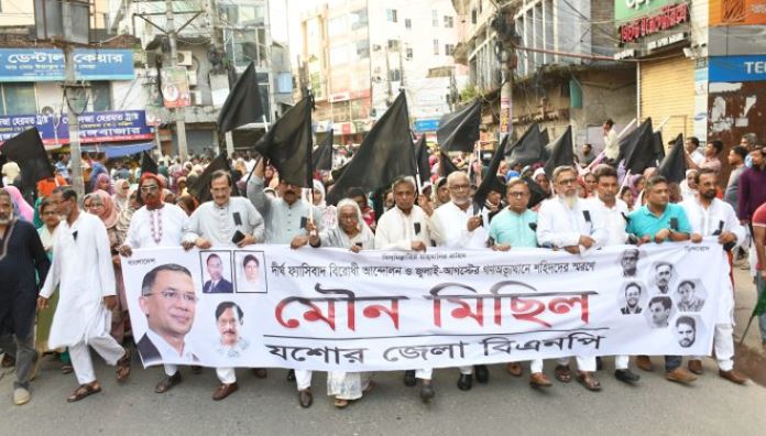 যশোরে বিএনপির আয়োজনে জুলাই-আগস্টের গণঅভ্যুত্থানে শহীদদের স্মরণে দোয়া মাহফিল ও মৌন মিছিল অনুষ্ঠিত হয়েছে। শুক্রবার (১৮ জুলাই) বিকেলে যশোর জেলা