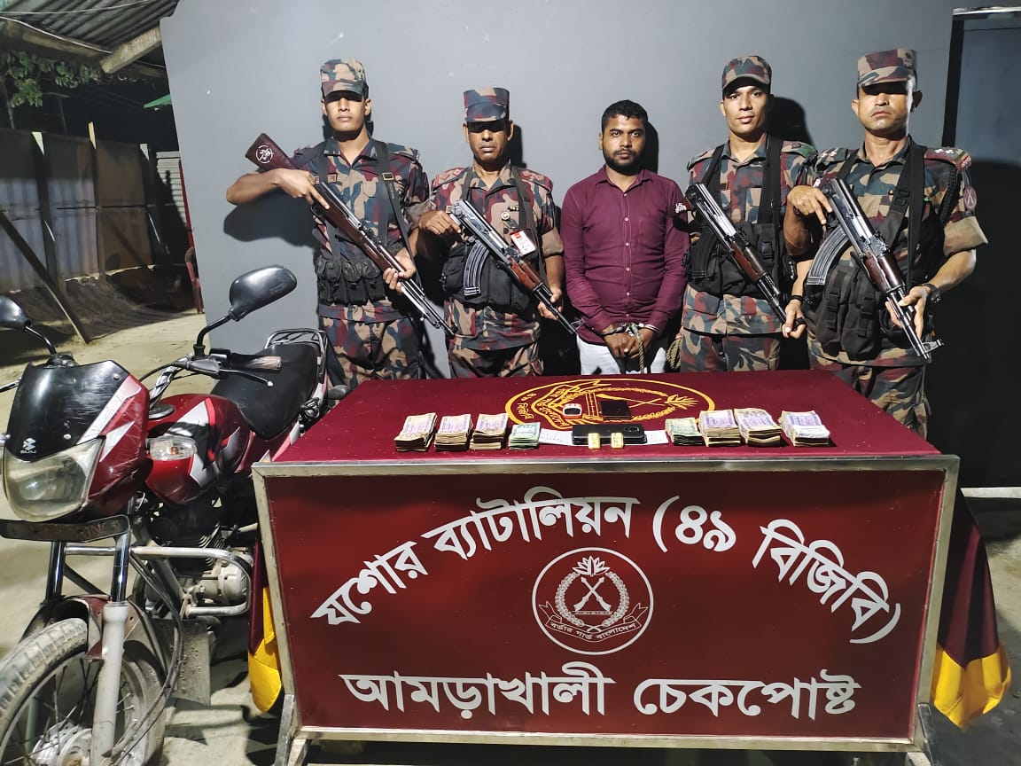 যশোরের বেনাপোল আমড়াখালি বিজিবি চেকপোস্ট থেকে (২৩৪ গ্রাম ওজন) ২টি স্বর্ণের বার ও হুন্ডির টাকাসহ ইয়ামিন (২৫) নামে এক পাচারকারীকে