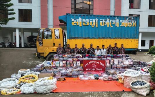 বেনাপোলে কার্গো ট্রাকসহ দুই কোটি ৫৫ লাখ টাকা মূল্যের ভারতীয় শাড়ী, থ্রি পিচ, ওষুধ, মোটরসাইকেলের টায়ার এবং বিভিন্ন প্রকার কসমেটিক্স