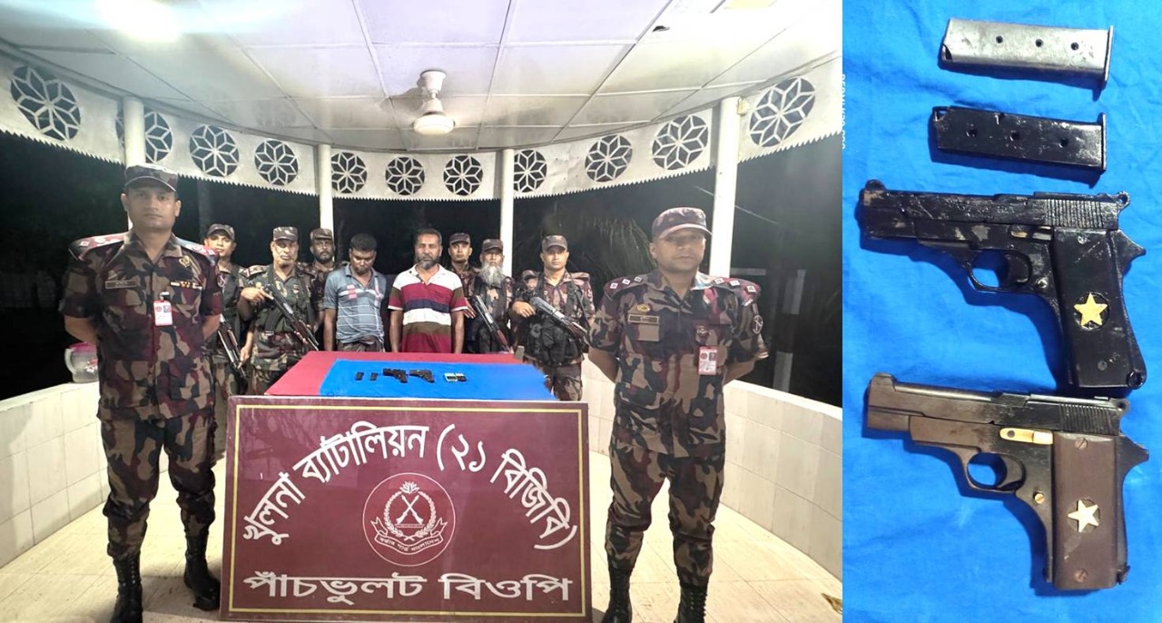 যশোরের শার্শার পাঁচভুলোট সীমান্তে অভিযান চালিয়ে দুটি বিদেশি পিস্তল ও দুটি ম্যাগজিনসহ দুইজন অস্ত্র ব্যবসায়ীকে আটক করেছে বর্ডার গার্ড বাংলাদেশ