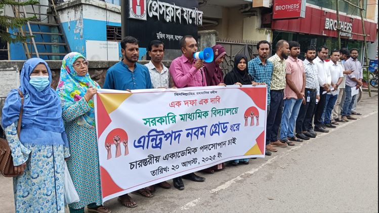সরকারি মাধ্যমিক বিদ্যালয়ে এন্ট্রিপদ ৯ম গ্রেড ধরে চারস্তরীয় একাডেমিক পদসোপান চাই” এই এক দফা দাবিকে সামনে রেখে যশোরে মানববন্ধন করেছে