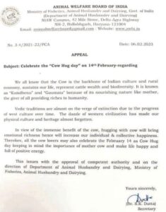বিজ্ঞপ্তিতে জানানো হয়েছে, আগামী ১৪ ফেব্রুয়ারি গরুকে আলিঙ্গন করার জন্য সবাইকে আহ্বান জানানো হচ্ছে। পাশ্চাত্য সংস্কৃতির প্রভাবে ভারতের বৈদিক সংস্কৃতি একেবারে মুছে যেতে বসেছে। সকলে পাশ্চাত্যের চাকচিক্যের কারণে ভারতের ঐতিহ্য আর সংস্কৃতিকে ভুলতে বসেছে। সেই কারণেই এই অভিনব উদ্যোগ নেয়া হয়েছে ভারত সরকারের পক্ষ থেকে।